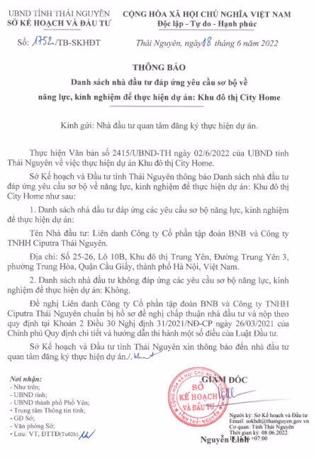 Theo đó, Sở Kế hoạch và Đầu tư tỉnh Thái Nguyên vừa công bố danh sách nhà đầu tư đáp ứng yêu cầu sơ bộ về năng lực, kinh nghiệm để thực hiện dự án Khu đô thị City Home. Danh sách Chủ đầu tư là nhà đầu tư duy nhất đáp ứng được yêu cầu thực hiện dự án là liên danh Công ty CP Tập đoàn BNB và Công ty TNHH Ciputra Thái Nguyên.
