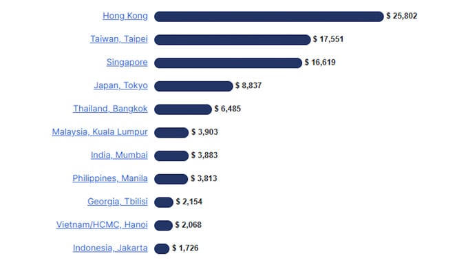 Tiếp theo là Singapore (423 triệu/m2), Tokyo (225 triệu/m2), Bangkok (165 triệu/m2), Kuala Lumpur (99 triệu/m2), Mumbai (98 triệu/m2), Manila (97 triệu/m2), Tbilisi (55 triệu/m2).