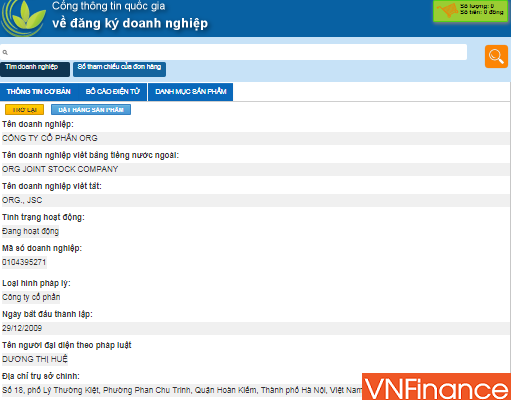 Thông tin về Công ty ORG trên Cổng thông tin đăng ký doanh nghiệp quốc gia.