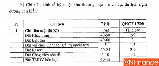 Khu thương mại - dịch vụ, du lịch nghỉ dưỡng ven biển sẽ được xây dựng với mật độ như sau: