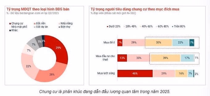 Theo Batdongsan.com.vn, chung cư là phân khúc dẫn đầu lượng quan tâm trong 6 tháng đầu năm 2025. Điều này cho thấy hành vi người mua đang dịch chuyển rõ rệt từ xu hướng đầu cơ sang nhu cầu ở thực và đầu tư khai thác dòng tiền ổn định.