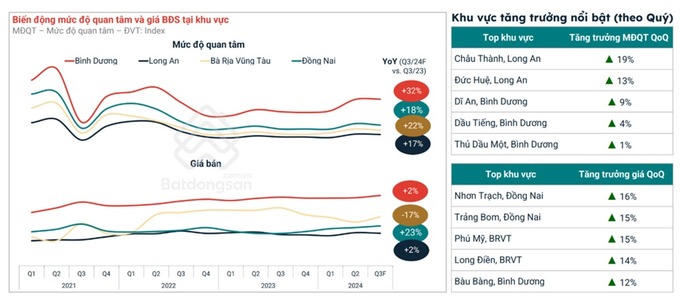 Cụ thể, mức độ quan tâm bất động sản Bình Dương quý III/2024 tăng 32% so với cùng kỳ năm trước. Trong khi đó, các địa phương khác như Long An, Bà Rịa Vũng Tàu, Đồng Nai có mức tăng từ 17%-22%. Mức độ quan tâm chung cư tại Dĩ An, Thủ Dầu Một và Bàu Bàng trong quý III/2024 dự kiến tăng lần lượt 20%, 11% và 10% so với quý II/2024.