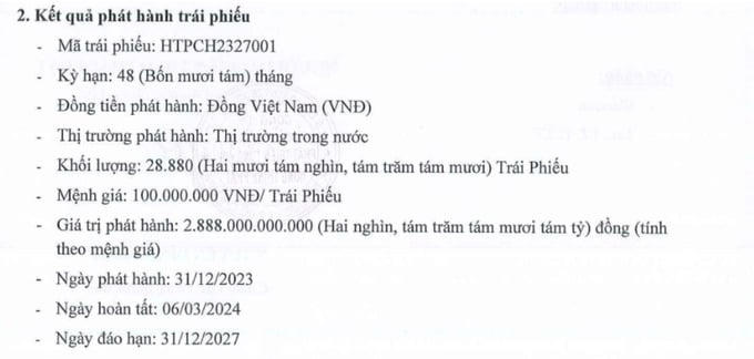 Theo đó, lô trái phiếu mã HTPCH2428001 đã được phát hành và hoàn tất trong ngày 17/07, với số lượng 4.120 trái phiếu, mệnh giá 100 triệu đồng/trái phiếu, với kỳ hạn 48 tháng, đáo hạn vào 17/07/2028. Lãi suất 12%/năm cho 2 kỳ đầu tiên, các kỳ tiếp theo là 12% cộng với lãi suất áp dụng cho các kỳ tính lãi tiếp theo là 4.5%/năm và lãi suất tham chiếu tại ngày xác định kỳ lãi suất.