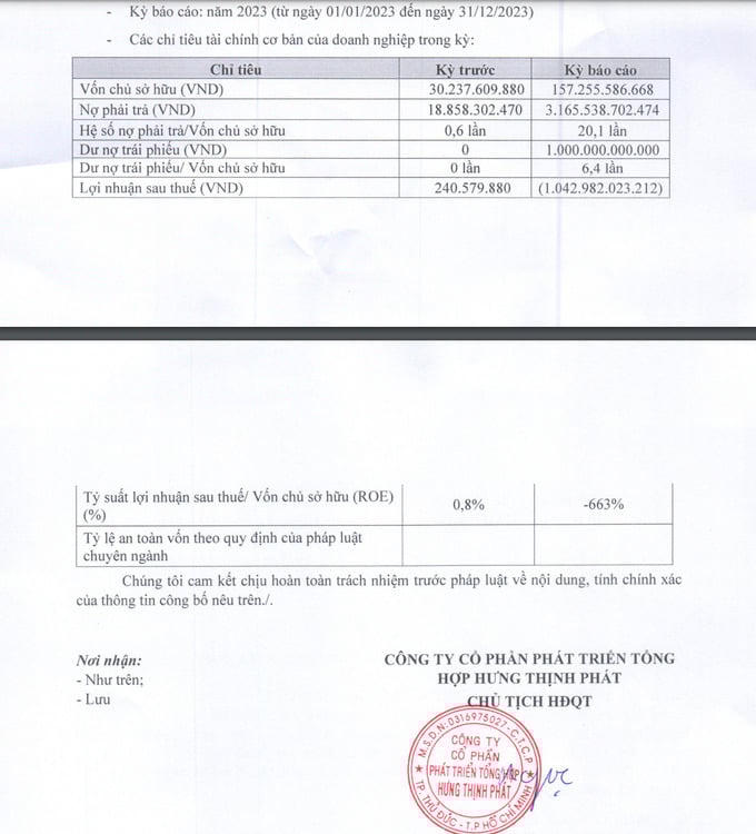 Theo báo cáo tài chính năm 2023 của Hưng Thịnh Phát cho thấy, công ty này có khoản lỗ rất lớn lên đến 1.043 tỷ đồng, trong khi năm 2022 ghi nhận khoản lãi hơn 240 triệu đồng. Đồng thời, vốn chủ sở hữu tăng gấp 5,2 lần lên con số hơn 157 tỷ đồng, cùng với đó nợ phải trả tăng gấp 168 lần lên đến 3.166 tỷ đồng, theo đó hệ số nợ phải trả/vốn chủ sở hữu tăng 20,1 lần trong khi năm 2022 chỉ là 0,6 lần. và dự nợ trái phiếu 1.000 tỷ đồng. Tỷ suất lợi nhuận sau thuế/vốn chủ sở hữu (ROE) từ dương 0.8% chuyển sang âm 663%.