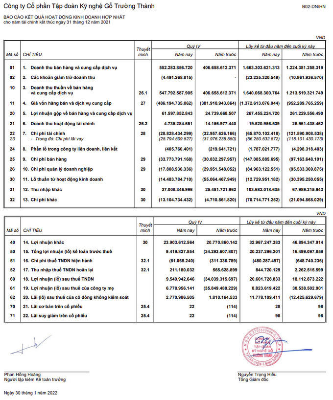 Theo báo cáo tài chính kiểm toán, Công ty CP Tập đoàn Kỹ nghệ gỗ Trường Thành (Mã CK: TTF) lỗ ròng gần 9 tỷ đồng trong năm 2021. Dù trước đó theo báo cáo tự lập, doanh nghiệp này lại lãi ròng gần 9 tỷ đồng.