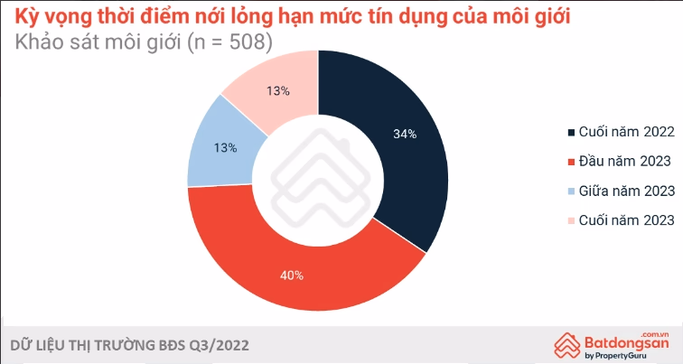 Trong bối cảnh này, nhiều bên tham gia thị trường bất động sản đặt kỳ vọng vào việc tăng trưởng room tín dụng. Khảo sát gần đây của Batdongsan.com.vn với hơn 500 thành viên thị trường bất động sản tiết lộ hơn 34% đáp viên cho rằng hạn mức tín dụng sẽ được nới lỏng vào cuối năm 2022, 40% tin điều này sẽ diễn ra vào đầu năm 2023.