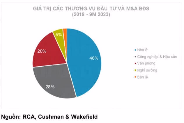 Chỉ trong 9 tháng đầu năm 2023, Việt Nam ghi nhận tổng lượng vốn đầu tư và M&A bất động sản đạt khoảng 4,2 tỷ USD, trong đó loại hình nhà ở và công nghiệp chiếm tỷ trọng lần lượng 46% và 28%. Điều này cho thấy khẩu vị của nhà đầu tư nước ngoài vẫn tập trung vào các loại tài sản truyền thống tại Việt Nam, phục vụ chính cho nhu cầu “an cư, lạc nghiệp”.