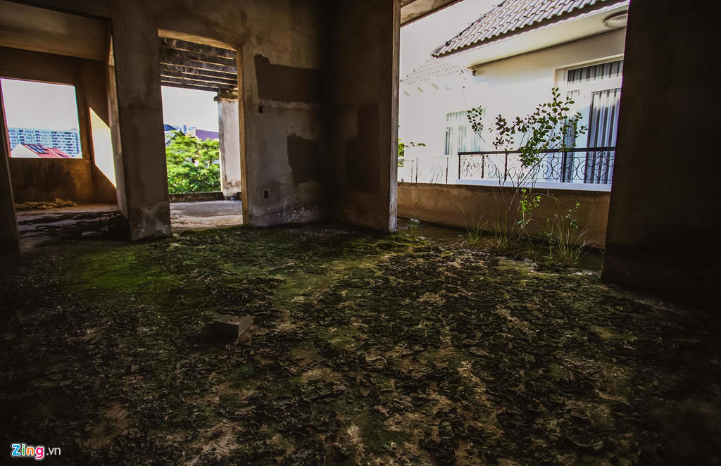 Rêu mốc, cây cối bao phủ hầu hết sàn nhà. Gần 10 năm nay, những ngôi biệt thự này vẫn nằm trơ khung, xuống cấp từng ngày.