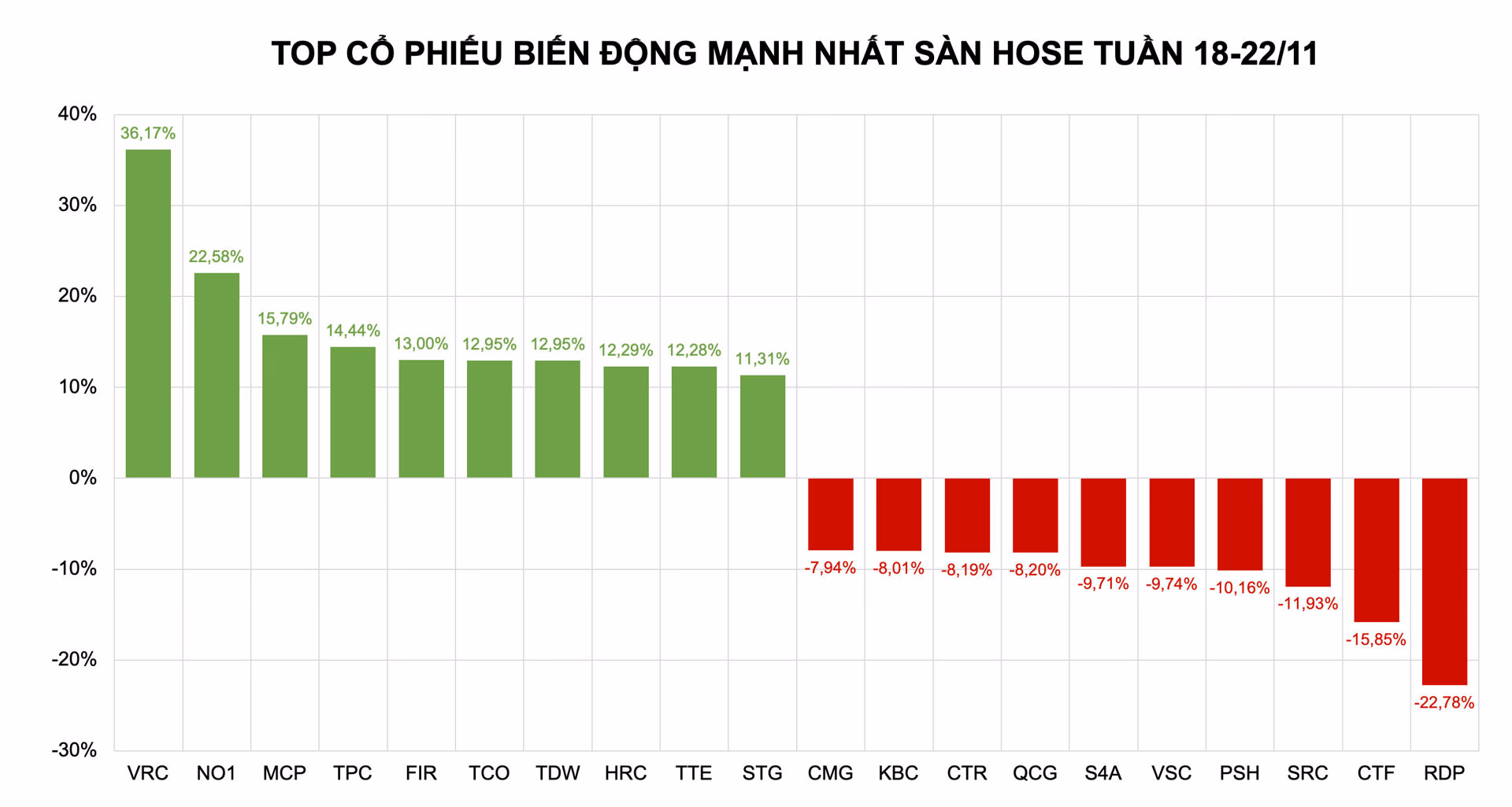 Sau MCP, những cái tên còn lại top 10 cổ phiếu tăng mạnh nhất sàn HoSE tuần vừa qua lần lượt là TPC (+14,44%), FIR (+13%), TDW (+12,92%), TCO (+12,95%), HRC (+12,29%), TTE (12,28%), STG (+11,31%).