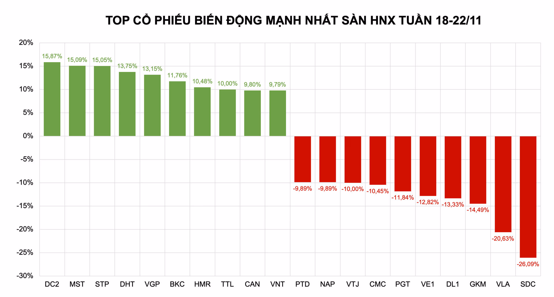 Ngược lại, top 10 cổ phiếu giảm mạnh nhất tuần là SDC (-26,09%), VLA (-20,63%), GKM (-14,49%), DL1 (-13,33%), VE1 (-12,82%), PGT (-11,84%), CMC (-10,45%), VTJ (-10%), NAP (-9,89%), PTD (-9,89%).