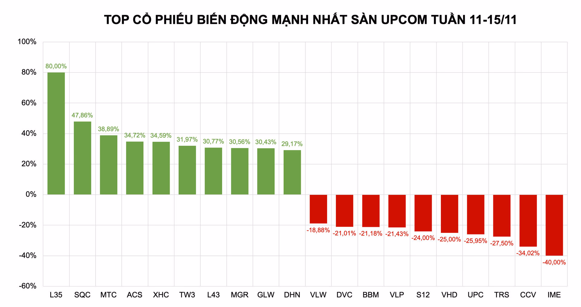 Ở chiều ngược lại, 10 mã giảm sâu nhất bao gồm: IME (-40%), CCV (-34,02%), TRS (-27,50%), UPC (-25,95%), VHD (-25%), S12 (-24%), BBM (-21,18%), DVC (-21,01%), VLW (-18,88%), DNT (-18,57%).