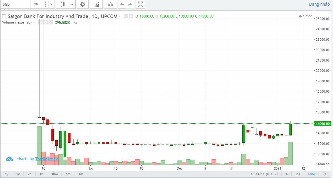 Trước đó, ngày 15/10/2020 là ngày đầu tiên giao dịch của 308 triệu cp SGB của Ngân hàng TMCP Sài Gòn Công Thương (Saigonbank) trên thị trường UPCoM, giá tham chiếu 25.800 đồng/cp, tổng giá trị chứng khoán đăng ký giao dịch 3.080 tỷ đồng. Tuy nhiên, cổ phiếu SGB nằm sàn ngay trong ngày đầu giao dịch trên UPCoM, chốt phiên 15/10 ở mức 15.500 đồng/cp so với giá tham chiếu 25.800 đồng/cp.