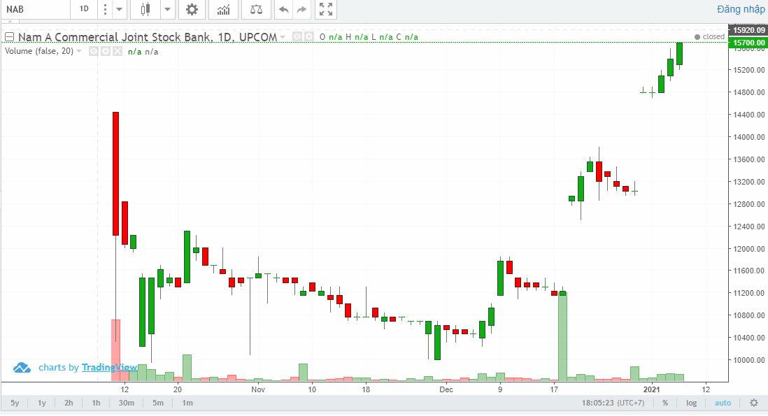 Tương tự, ngày 9/10/2020, cổ phiếu NAB của Ngân hàng TMCP Nam Á (Nam A Bank) lên sàn UPCoM. Thị giá NAB chốt phiên giao dịch đầu tiên ở mức 16.000 đồng/cp, tăng gần 19% so với mức giá tham chiếu 13.500 đồng/cp. Khối lượng giao dịch trong ngày đạt hơn 2.9 triệu cp.