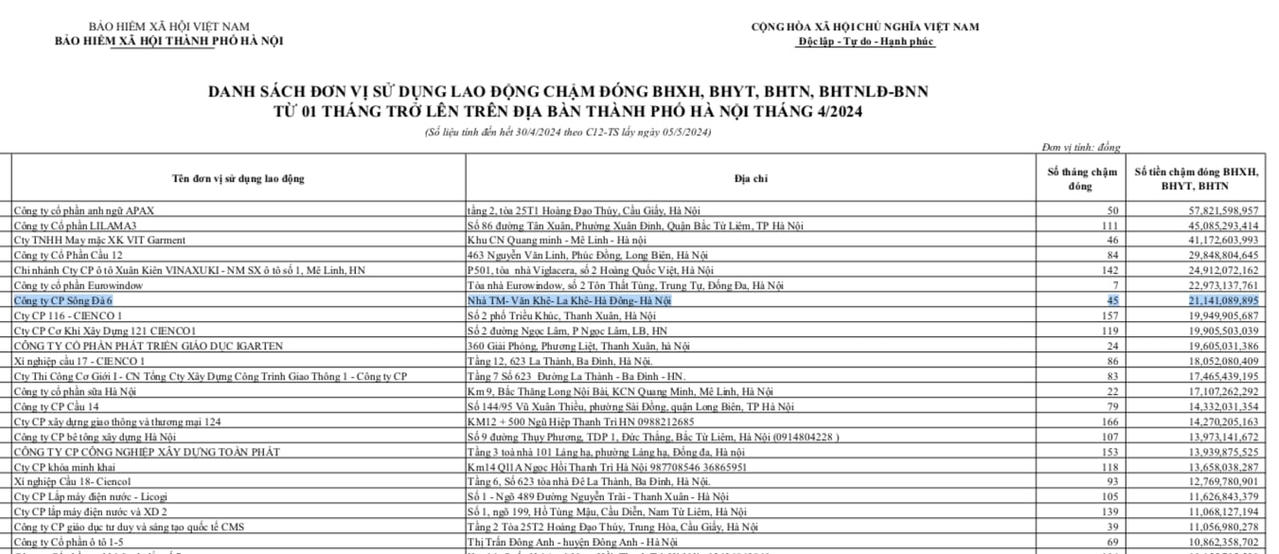 Mới đây nhất, Bảo hiểm Xã hội TP Hà Nội đã công bố danh sách đơn vị sử dụng lao động chậm đóng bảo hiểm xã hội, bảo hiểm y tế,… từ 1 tháng trở lên trên địa bàn TP Hà Nội tháng 4/2024 (số liệu tính đến hết 30/4/2024 theo C12-TS lấy ngày 5/5/2024).