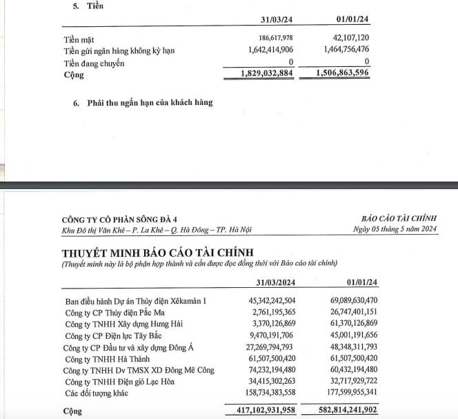 Trong kỳ, Sông Đà 4 có hơn 417 tỷ đồng phải thu ngắn hạn của khách hàng, trong đó nổi cộm như: Ban điều hành Dự án thuỷ điện Xêkamản 1 (45,3 tỷ đồng); CTCP Đầu tư và Xây dựng Đông Á (27,3 tỷ đồng); Công ty TNHH Hà Thành (61,5 tỷ đồng); Công ty TNHH dịch vụ thương mại SXXD Đông Mê Công (74,2 tỷ đồng), các đối tượng khác (158,7 tỷ đồng),… Tính đến ngày 31/3/2024, hàng tồn kho của Sông Đà 4 hơn 143,3 tỷ đồng, chiếm chủ yếu là chi phí sản xuất dở dang hơn 134,8 tỷ đồng.
