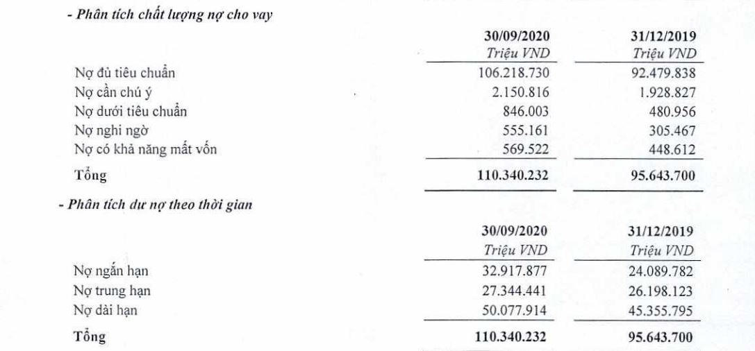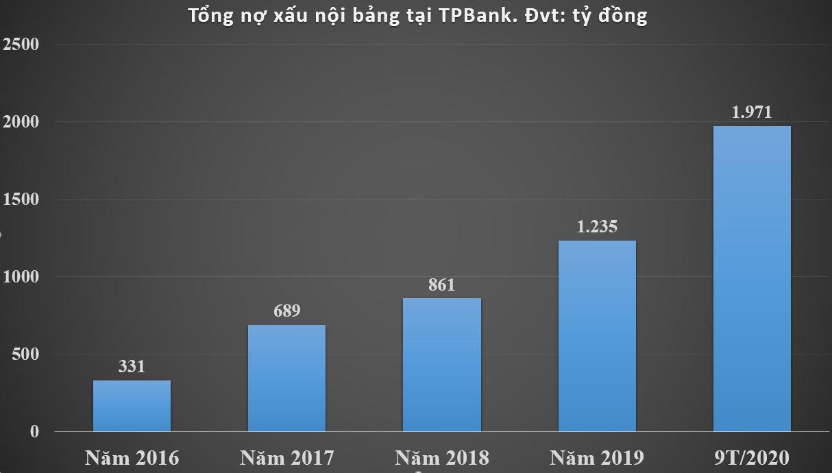 Về tình hình chất lượng nợ cho vay, tính đến ngày 30/09/2020, tổng nợ xấu của TPBank tăng đến 60% so với đầu năm, lên mức gần 1.971 tỷ đồng. Trong đó, nợ dưới tiêu chuẩn tăng 76% lên mức 846 tỷ đồng; nợ nghi ngờ tăng 82% lên mức 555 tỷ đồng; nợ có khả năng mất vốn tăng 27% lên mức 569 tỷ đồng. Do đó, kéo tỷ lệ nợ xấu trên dư nợ vay của TPBank tăng từ mức 1,29% đầu năm lên 1,79%.