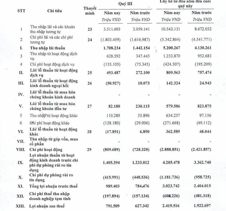 Cụ thể, 9 tháng đầu năm 2020, TPB ghi nhận chi phí lãi và các chi phí tương tự âm gần 5.343 tỷ đồng, tăng hơn 800 tỷ so với cùng kỳ năm trước; chi phí hoạt động dịch vụ ghi nhận âm 424 tỷ đồng, tăng hơn 200 tỷ đồng so với cùng kỳ năm trước; chi phí dự phòng rủi ro tín dụng âm gần 1.182 tỷ đồng, tăng hơn 200 tỷ đồng; chi phí hoạt động âm gần 2.889 tỷ đồng, tăng hơn 400 tỷ so với cùng kỳ; chi phí thuế thu nhập tạm tính âm hơn 604 tỷ đồng.