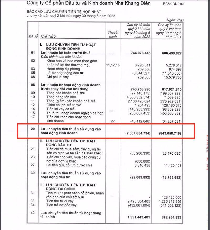 Đáng chú ý nhất phải kể đến Công ty Cổ phần Đầu tư và Kinh doanh Nhà Khang Điền (Mã CK: KDH), theo BCTC quý 2/2022 KDH, mặc dù 6 tháng đầu năm doanh nghiệp lãi hơn 625 tỉ đồng nhưng Nhà Khang Điền đang gặp vấn đề lớn với dòng tiền khi lưu chuyển tiền thuần từ hoạt động kinh doanh tiếp tục ghi nhận âm hơn 2.000 tỷ đồng trong nửa đầu năm do tồn kho tăng hơn 4.380 tỷ và các khoản phải trả tăng hơn 2.100 tỷ đồng. Riêng quý 2, dòng tiền kinh doanh của doanh nghiệp âm hơn 1.500 tỷ đồng.