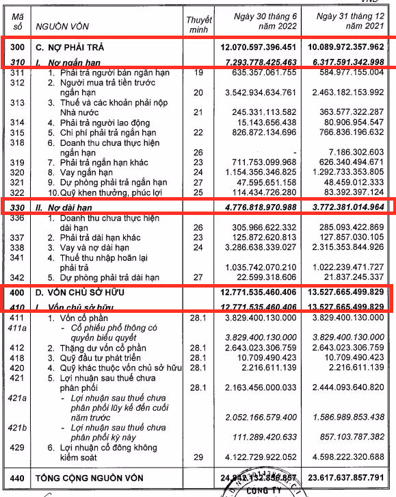 Ngoài ra, về nợ vay, tính tới cuối quý II, tổng nợ vay ngắn hạn và dài hạn tăng 56,9% so với đầu năm, tương ứng tăng thêm 723,1 tỷ đồng lên 1.993 tỷ đồng và chiếm tới 25,4% tổng nguồn vốn.