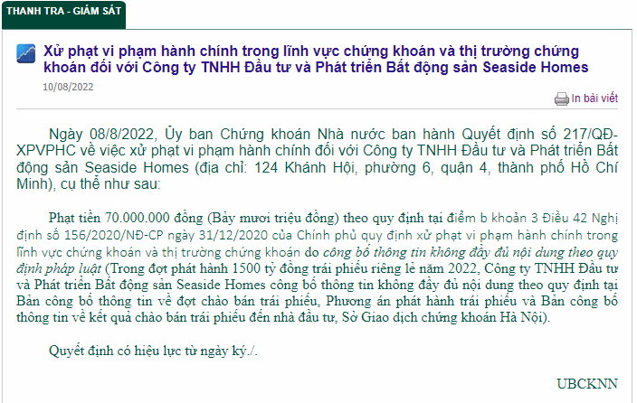 Seaside Homes bị phạt 70 triệu đồng do công bố thông tin không đầy đủ nội dung theo quy định pháp luật. Trong đợt phát hành 1.500 tỷ đồng trái phiếu riêng lẻ năm 2022, công ty công bố thông tin không đầy đủ nội dung theo quy định tại bản công bố thông tin về đợt chào bán trái phiếu, phương án phát hành trái phiếu và bản công bố thông tin về kết quả chào bán trái phiếu.