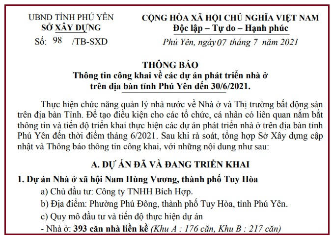 Phía Sở Xây dựng cho biết, việc công khai thông tin về các dự án đầu tư xây dựng phát triển nhà ở trên địa bàn tỉnh đến tháng 6/2021 là để các tổ chức, cá nhân có liên quan tiếp cận, nắm bắt thông tin và thực hiện nhằm nhận diện và tránh những thông tin sai lệch, không chính thống đăng tải trên các trang mạng xã hội. Đồng thời lưu ý đối với những dự án chưa có văn bản chấp thuận chủ trương đầu tư của cấp thẩm quyền, dự án chưa xác định chủ đầu tư, chưa có giấy phép xây dựng; chưa đủ điều kiên huy động vốn; chưa đủ điều kiện đưa vào khai thác kinh doanh.