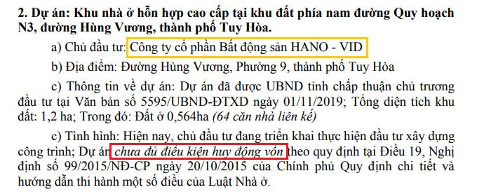 Mới đây, Sở Xây dựng tỉnh Phú Yên vừa có văn bản thông tin về các dự án bất động sản đã xác định chủ đầu tư, đang hoàn tất thủ tục để đầu tư xây dựng, chưa đủ điều kiện huy động vốn theo quy định. Trong đó có hai dự án của Công ty cổ phần đầu tư và kinh doanh bất động sản Hải Phát (Hải Phát Land) và Công ty Cổ phần Bất động sản Hano-Vid (công ty thuộc Tập đoàn TNG Holdings của bà Nguyễn Thị Nguyệt Hường).