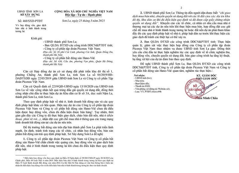 Cũng liên quan đến dự án chưa đủ điều kiện mở bán và huy động vốn của Hano – Vid, tháng 4/2021 vừa qua Sở Xây dựng tỉnh Sơn La có văn bản gửi Ủy ban nhân dân TP Sơn La, các cơ quan liên quan, Công ty Cổ phần tập đoàn Picenza Việt Nam và Công ty Cổ phần Bất động sản Hano – Vid về việc huy động vốn, giao dịch bán nhà ở hình thành trong tương lai tại Dự án Picenza Riverside
