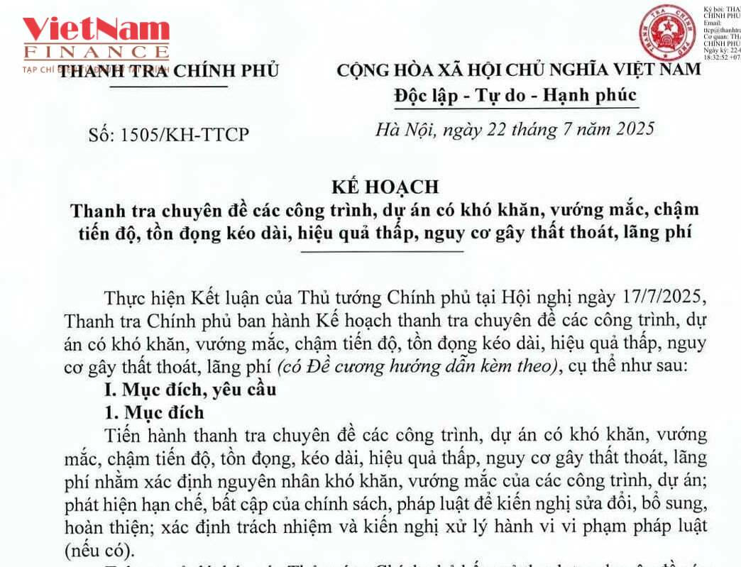 Kế hoạch 1505/KH-TTCP (22/7/2025) tập trung thanh tra các dự án trên 100 tỷ đồng thuộc doanh nghiệp nhà nước và các dự án địa phương từ 1.500 tỷ đồng trở lên. Trong danh sách đó, các dự án của HUD xuất hiện với mật độ dày đặc, trải rộng từ Hà Nội tới Quảng Ngãi, Hà Tĩnh.