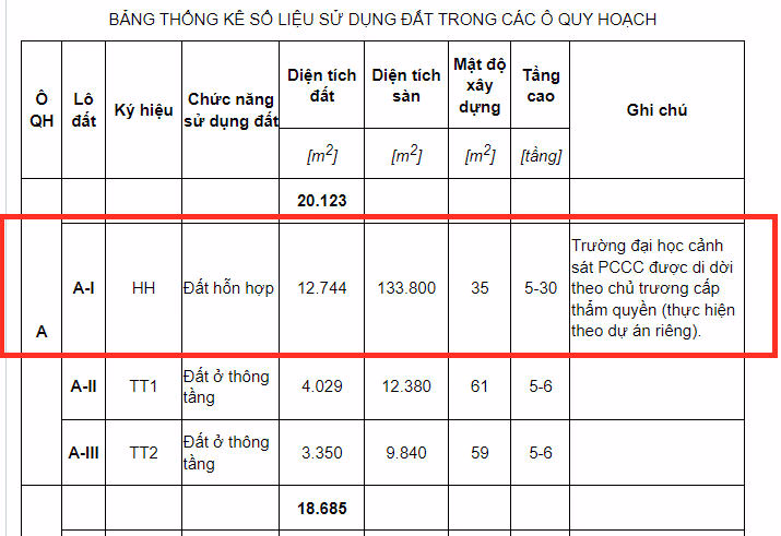 Cụ thể, tại ô quy hoạch A, lô đất A1-HH có chức năng sử dụng đất là đất hỗn hợp, diện tích 12.123 m2, diện tích sàn xây dựng 133.800 m2, mật độ xây dựng 30m2 và chiều cao được quy hoạch từ 5 – 30 tầng.