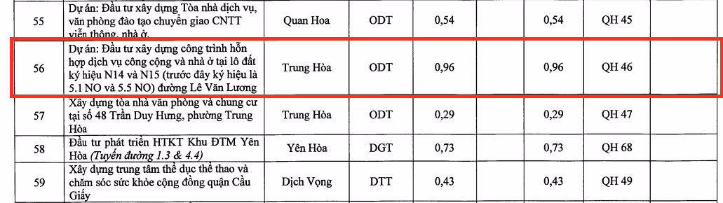 Theo hồ sơ quy hoạch sử dụng đất quận Cầu Giấy 2021 - 2030 được đăng tải trên Cổng thông tin điện tử Sở TN&MT Hà Nội, phần diện tích phía tây nam khu đất nói trên được bố trí cho dự án Đầu tư xây dựng công trình hỗn hợp dịch vụ công cộng và nhà ở tại lô đất ký hiệu N14 và N15 (gọi tắt là dự án N14, N15).