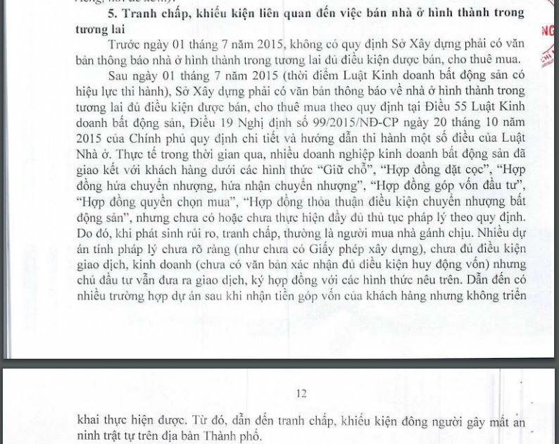 Sở Xây dựng TP HCM cho biết, nhiều trường hợp dự án sau khi nhận tiền góp vốn của khách hàng nhưng không có đủ tiền để triển khai. Từ đó dẫn đến tranh chấp, khiếu kiện đông người gây mất an ninh trật tự trên địa bàn thành phố.