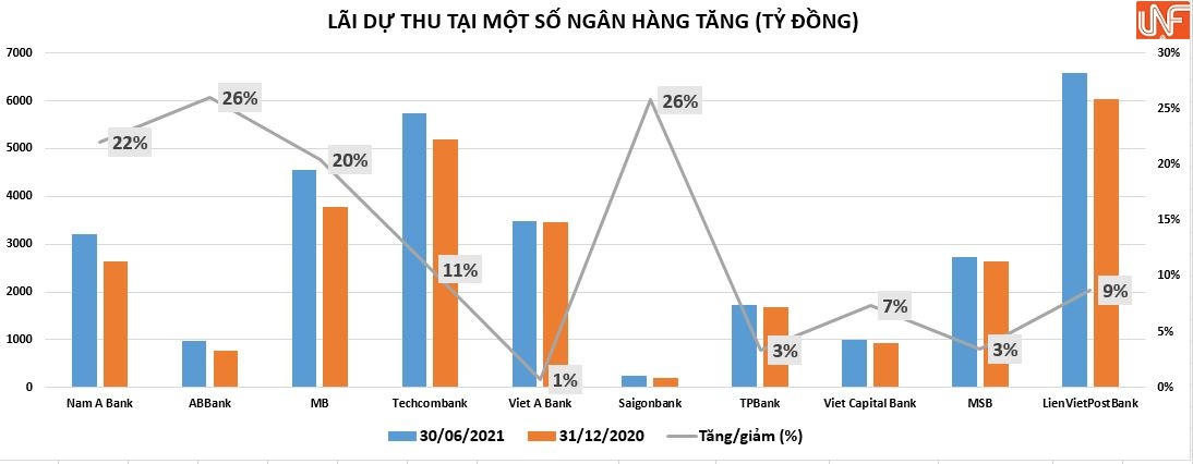 Đáng chú ý, tính đến 30/6/2021, nhiều ngân hàng ghi nhận lãi dự thu cùng nợ xấu đều tăng so với đầu năm.