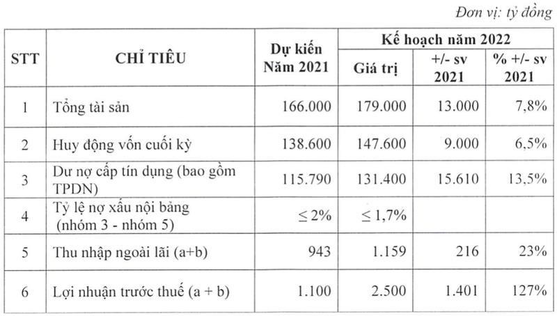 Nhà băng này đặt mục tiêu lợi nhuận năm 2022 đạt 10.500 tỷ đồng, tăng 31% so với năm 2021. Các chỉ tiêu về tổng tài sản, tổng dư nợ tín dụng và huy động vốn đều tăng 30%, lần lượt là 402.500 tỷ đồng; 265.600 tỷ đồng và 280.600 tỷ đồng. Trong đó, mức tăng trưởng tổng dư nợ tín dụng có thể được điều chỉnh tùy thuộc vào giới hạn cho phép của Ngân hàng Nhà nước.