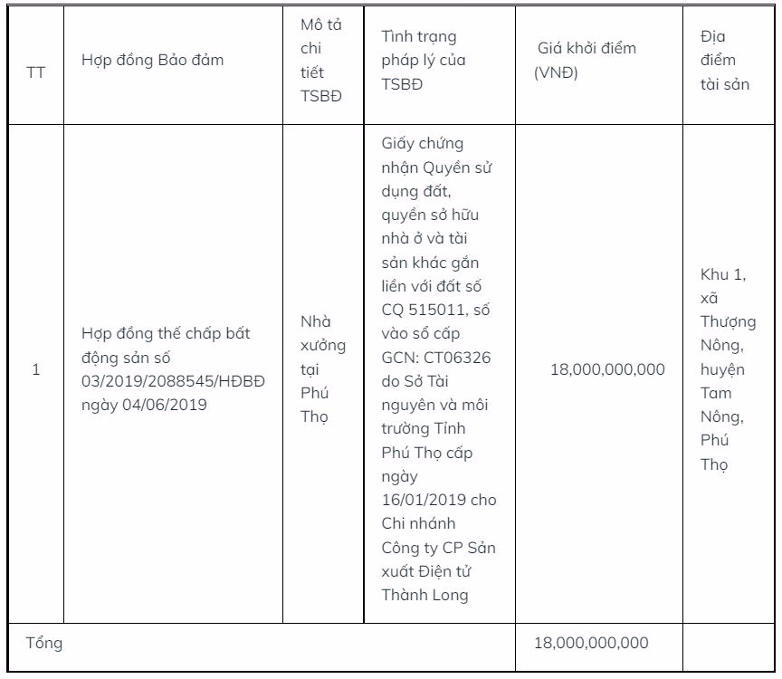Tại Ngân hàng BIDV chi nhánh Hoàng Mai đã rao bán tài sản là tài sản bảo đảm cho nghĩa vụ trả nợ của CTCP sản xuất điện tử Thành Long.