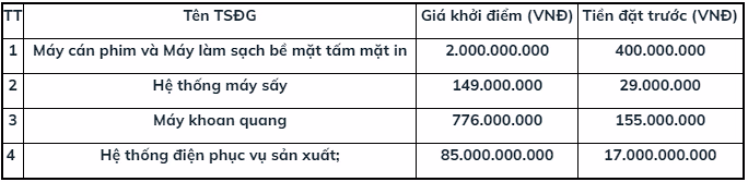 Theo đó, tài sản đấu giá bao gồm hệ thống điện phục vụ sản xuất, hệ thống phòng sạch, hệ thống máy nén khí Hitachi và tài sản gắn liền với đất là nhà xưởng sản xuất số tại Bắc Ninh với giá khởi điểm là 85 tỷ đồng; Máy cán phim và máy làm sạch bề mặt tấm mặt in có giá khởi điểm là 2 tỷ đồng; Máy khoan quang và hệ thống máy sấy có giá khởi điểm lần lượt là 776 và 149 triệu đồng.