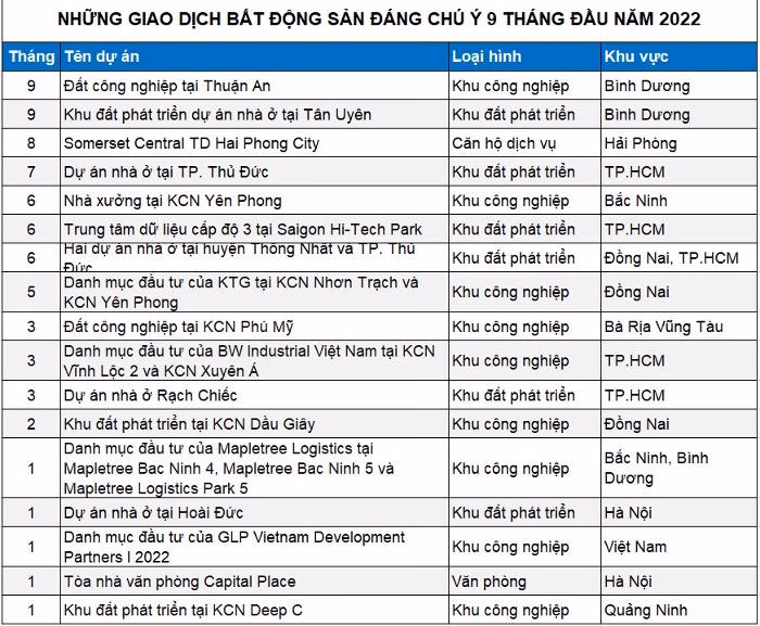 Theo bà Trang Bùi - Tổng Giám đốc Cushman & Wakefield, phần lớn các giao dịch đã chốt đến từ những nhà đầu tư đã rất am hiểu về biến động rủi ro và nhu cầu thị trường với mục đích tìm kiếm tỉ lệ sinh lời tốt hoặc mở rộng danh mục đầu tư trong khu vực. Các thương vụ đã được đàm phán trong thời gian gián đoạn do đại dịch Covid-19 và đạt được thỏa thuận trong năm 2022, thúc đẩy số lượng các thương vụ 9 tháng qua gia tăng.