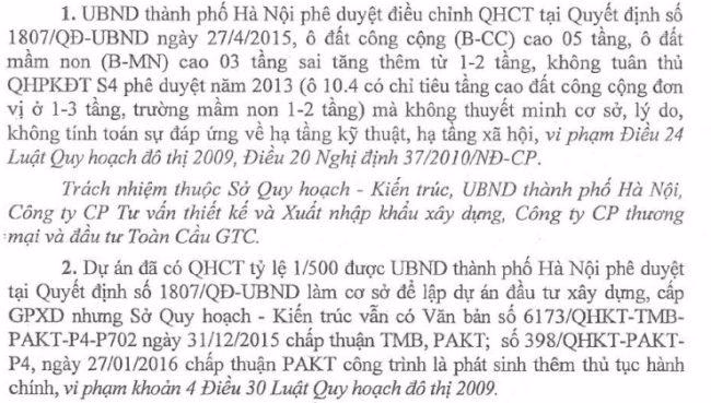 Theo đó, UBND TP Hà Nội phê duyệt điều chỉnh quy hoạch chi tiết tại Quyết định số 1807 năm 2015, ô đất công cộng cao 5 tầng, ô đất mầm non cao 3 tầng sai tăng thêm từ 1-2 tầng, không tuân thủ quy hoạch đô thị phân khu S4 phê duyệt năm 2013 mà không thuyết minh cơ sở, lý do là không tính toán về sự đáp ứng hạ tầng kỹ thuật, hạ tầng xã hội.
