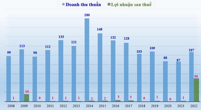 Năm 2022, công ty đạt 107 tỷ đồng doanh thu thuần, tăng 24% so cùng năm trước (YoY). Các khoản chi phí như lãi vay, quản lý doanh nghiệp cũng tăng theo lợi nhuận thuần từ hoạt động kinh doanh âm. Tuy nhiên, lợi nhuận sau thuế tăng đột biến so với năm trước đó chủ yếu do lợi nhuận khác tăng 63 tỷ đồng so với 1 tỷ đồng của năm 2021 vì công ty bán tài sản đã được đại hội đồng cổ đông bất thường tổ chức ngày 19/8/2022 thông qua.