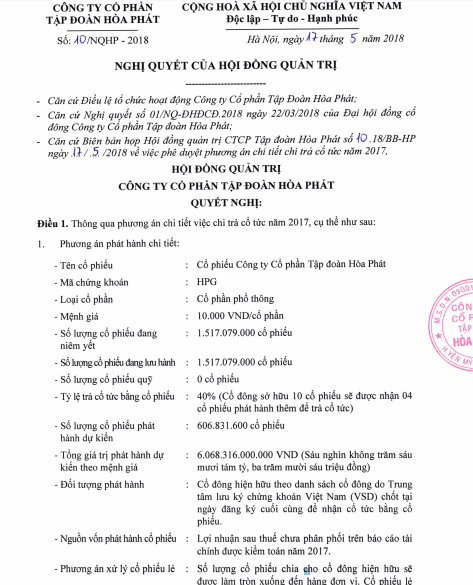 Bên cạnh đó, HĐQT của Hòa Phát cũng thông qua phương án chia cổ tức của năm 2017 với tỷ lệ chi trả là 40% và bằng cổ phiếu.