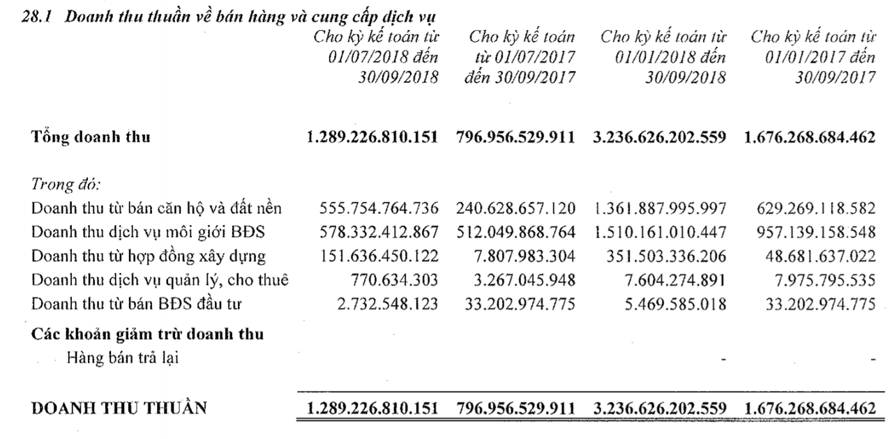 Cơ cấu doanh thu quý III ghi nhận sự tăng mạnh về mảng bán căn hộ và đất nền với con số 951 tỷ đồng. Mảng hợp đồng xây dựng tăng đột biến lên 151 tỷ đồng, trong khi doanh thu môi giới lại giảm đến 64% còn 183 tỷ đồng.
