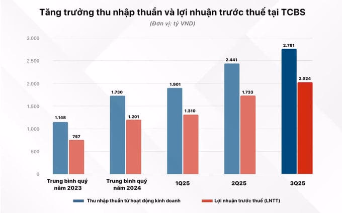 Lợi nhuận trước thuế (LNTT) quý 3/2025 của TCBS tiếp tục tăng trưởng bứt phá kỷ lục, đạt 2.024 tỷ đồng, tăng trưởng 85% so với cùng kỳ năm ngoái. Lũy kế 9 tháng đầu năm 2025, LNTT của Công ty đạt 5.067 tỷ đồng, tăng 31% so với cùng kỳ 2024 và đạt gần 90% kế hoạch cả năm 2025.