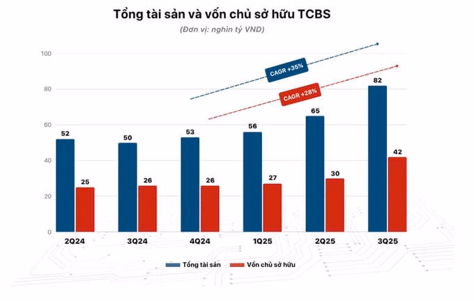 Tổng tài sản của TCBS tại 30/9/2025 đạt gần 81.773 tỷ đồng, tăng 26% so với quý trước và tăng 54% so với cuối năm 2024. Động lực tăng trưởng chính đến từ Cho vay ký quỹ và tăng đầu tư vào các tài sản tài chính nhằm tối ưu nguồn vốn.