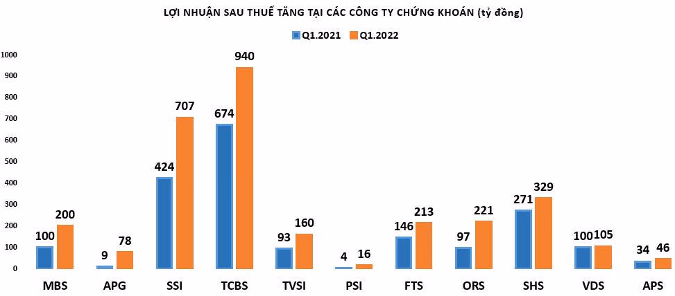 Ngoài ra, chứng khoán Châu Á-Thái Bình Dương ghi nhận 46,3 tỷ đồng lợi nhuận sau thuế, tăng 36,07% so với cùng kỳ năm ngoái; Chứng khoán FPT (FPTS) lãi trước thuế quý 1 đạt 253,5 tỷ đồng, tăng 52% so với cùng kỳ và hoàn thành 37% mục tiêu cả năm đề ra; Chứng khoán Dầu khí (PSI) báo lãi tăng gấp 3,7 lần đạt hơn 15,6 tỷ đồng. Với kết quả đạt được, CTCK này đã thực hiện được hơn 69% mục tiêu lợi nhuận đề ra năm 2022;...