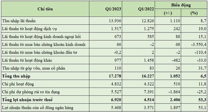 Lãi thuần từ hoạt động kinh doanh ngoại hối tăng 15,1% YoY (+88 tỷ đồng), đạt 673 tỷ đồng và chiếm 3,9% tổng thu nhập hoạt động. Lãi thuần từ mua bán chứng kinh doanh đạt 66 tỷ đồng trong khi cùng kỳ năm trước lỗ 2 tỷ đồng. Thu nhập từ góp vốn, mua cổ phần tăng 31,7% YoY (+26 tỷ đồng).