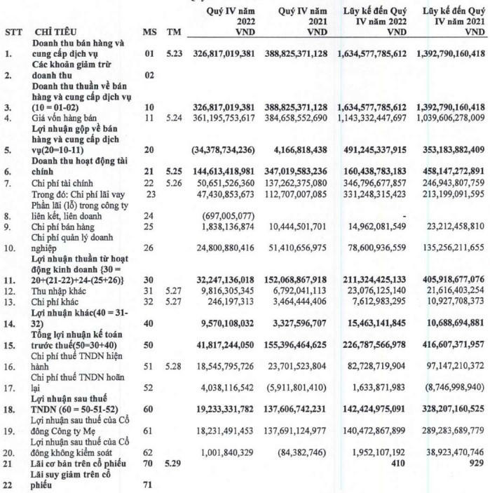 Tuy nhiên, giá vốn hàng bán tăng cao, đặc biệt trong mảng bất động sản đã khiến công ty này lỗ gộp 34 tỷ đồng trong quý cuối cùng của năm 2022, trong khi cùng kỳ ghi nhận mức lãi dương hơn 4 tỷ. Trong quý IV, Hải Phát Invest thoát lỗ nhờ nguồn thu gần 145 tỷ đồng từ hoạt động tài chính và việc tiết giảm hầu hết chi phí phát sinh từ bán hàng cho tới quản lý doanh nghiệp và thu về hơn 19 tỷ đồng lợi nhuận sau thuế. So với cùng kỳ năm trước đó, mức lợi nhuận ròng này của Hải Phát Invest đã giảm 7 lần.
