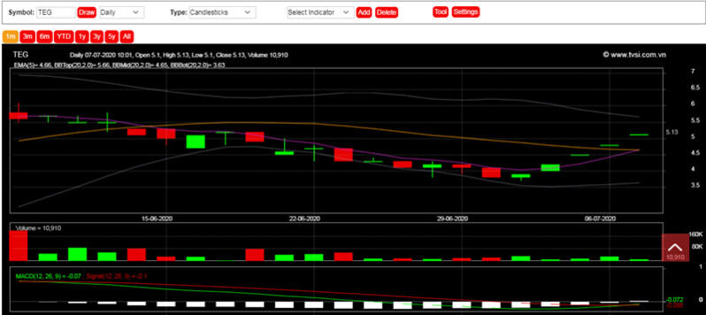 Diễn biến giá cổ phiếu TEG 1 tháng trở lại đây. Sáng nay ngày 07/07/2020, cổ phiếu TEG mở cửa ở mức giá 5.100 đồng/CP.