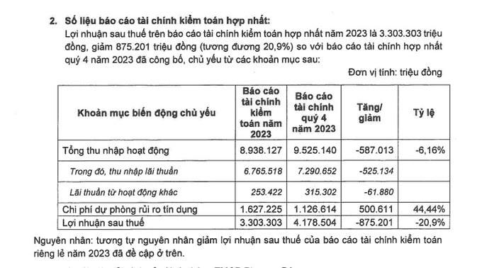 Sau kiểm toán, tổng thu nhập hoạt động của ngân hàng ghi nhận 8.935 tỷ đồng, giảm 587 tỷ đồng so với báo cáo quý 4/2023, tương đương mức giảm 6%. Trong đó, thu nhập lãi thuần giảm 525 tỷ đồng và lãi từ hoạt động khác giảm 61 tỷ đồng.