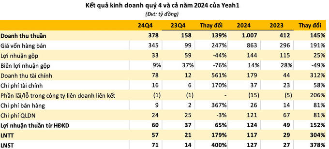 Lũy kế cả năm 2024, doanh thu thuần của Yeah1 vượt mốc 1000 tỷ đồng, gấp 2,5 lần đồng thời là mức doanh thu cao nhất trong vòng 3 năm trở lại đây. Lợi nhuận sau thuế xấp xỉ 127 tỷ đồng, tăng gần 380% và là mức lãi này cao nhất từ 2018 và cao thứ nhì kể từ khi doanh nghiệp này công bố thông tin.