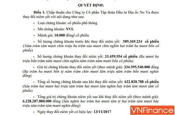 Ngày 9/11 vừa qua, Sở Giao dịch Chứng khoán TP Hồ Chí Minh đã ra quyết định số 410/QĐ-SGDHCM chấp thuận cho CTCP Tập đoàn Đầu tư Địa ốc No Va – Novaland được thay đổi niêm yết trên sàn chứng khoán.