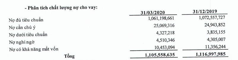 Cụ thể, tính đến ngày 31/03/2020, cho vay khách hàng của Ngân hàng suýt soát cùng kỳ so với đầu năm, ghi nhận hơn 1.1 triệu tỷ đồng. Tổng nợ xấu cũng giảm nhẹ 1% so với đầu năm, ở mức gần 19.291 tỷ đồng. Do đó, tỷ lệ nợ xấu trên dự nợ vay duy trì ở mức 1,74%.